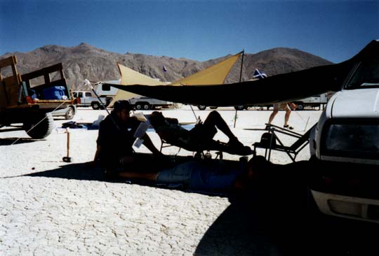 In the Black Rock Desert, the heat of the day is, well, hot. We made a makeshift shelter out of tarp and ski poles, attached it to the side of my trusty VW Golf, and lounged on our therma-rests, eating figs, almonds, and cheese, water always close at hand...