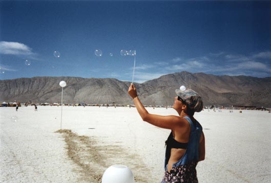 Deb raises a bubble wand to the desert wind...