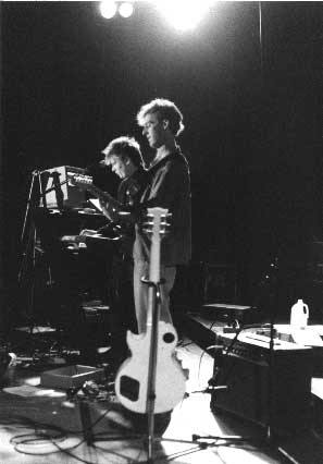 Matt kicks his head back for a high note. That's his white custom Les Paul in the foreground, and my trusty Mac Plus glowing softly in the background.