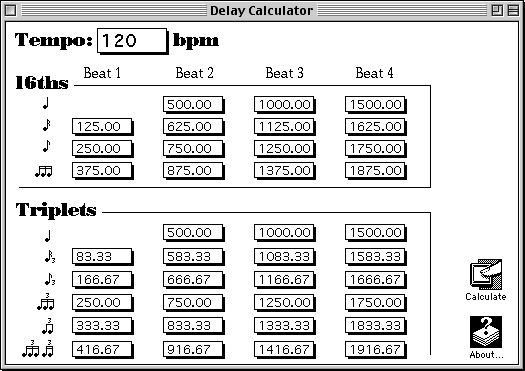 Hypercard Delay CalculatorSome time ago, I created a handy little Hypercard stack (for MacOS) for calculating multitap delays, which can be downloaded below. There are several other good delay calculators, but as far as I know this is the only one that displays all times, in fractions of a millisecond, for four beats of 16th notes and 16th note triplets. Handy for use with multitap delays, especially on gear made before tempo sync became ubiquitous. Make sure to click on the "About" button for instructions and tips! Download Hypercard Delay Calculator (MacOS, 12k) If you don't have Hypercard, you'll need to download and install the free Hypercard Player software from Apple's site. It's a Classic application, of course, but it seems to work just fine under OSX. Note that you need to install at least the application and the "Home" document. Download Hypercard Player (link to Apple's site) |